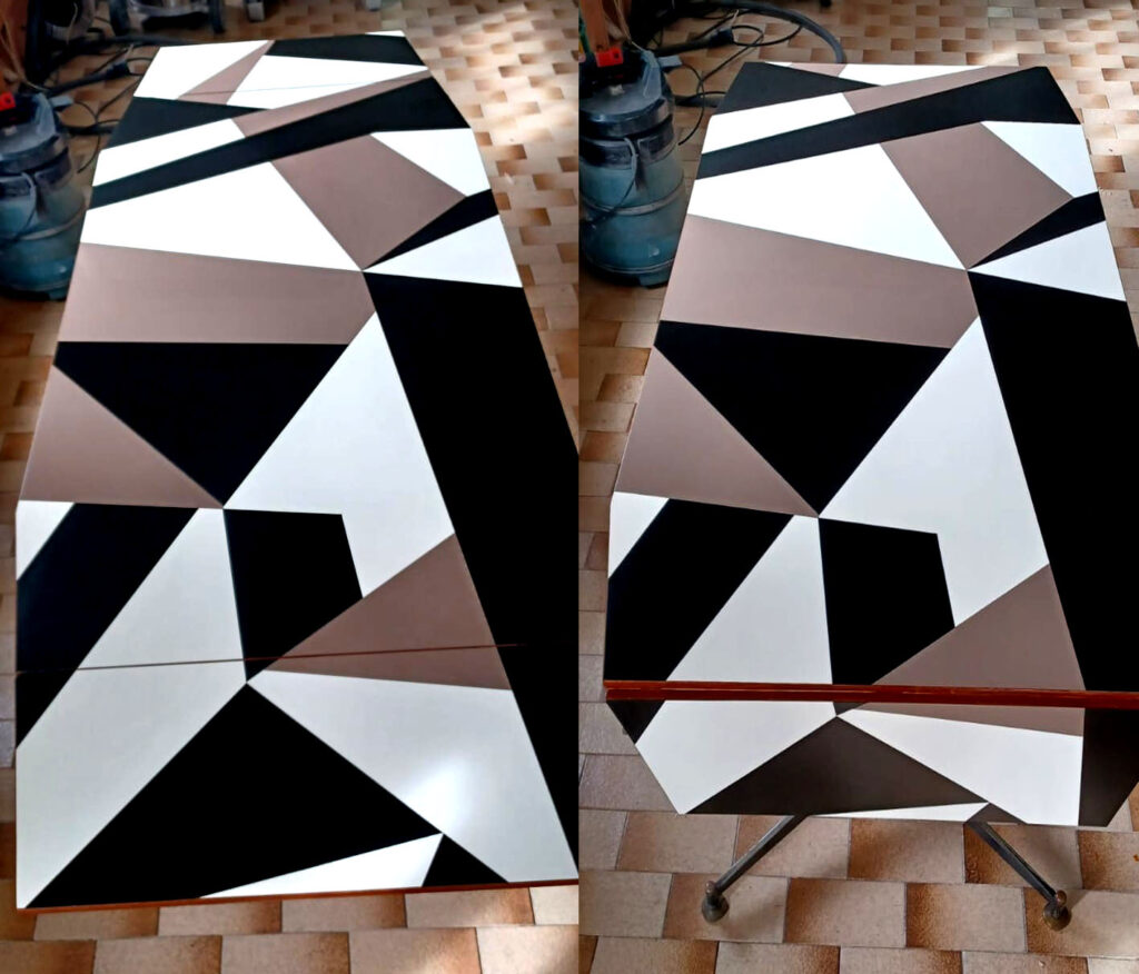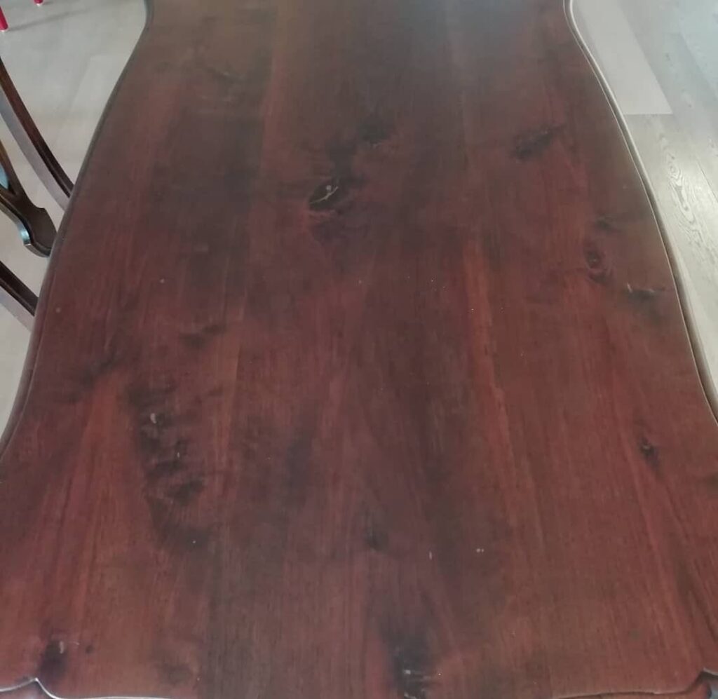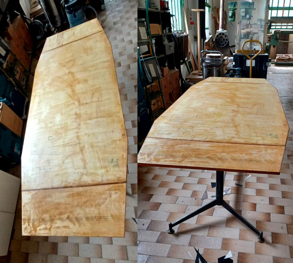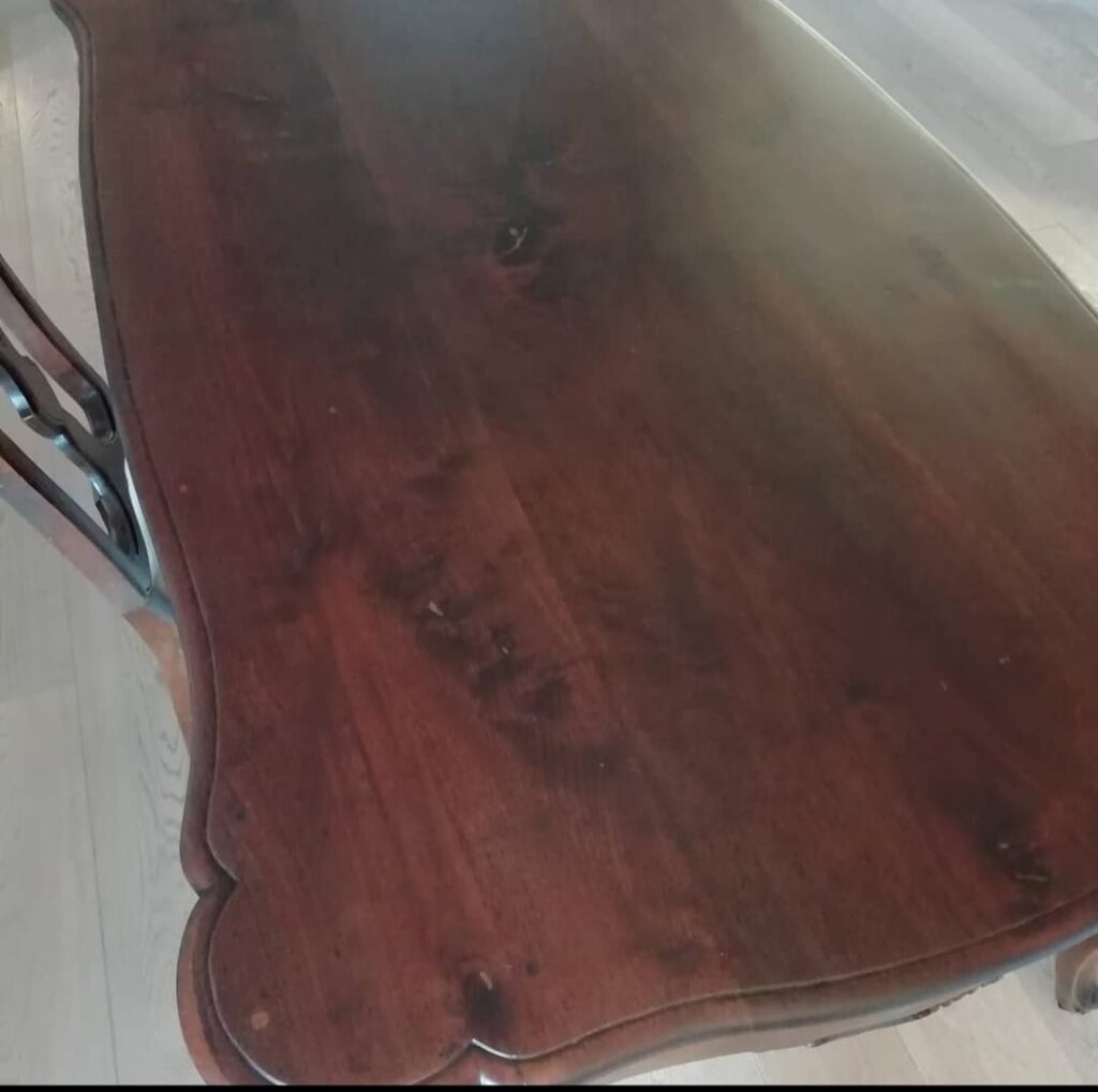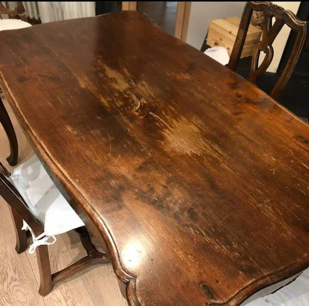 Restauro tavolo con rinnovo del piano – PRIMA Restauro tavolo con rinnovo del piano – DOPO
